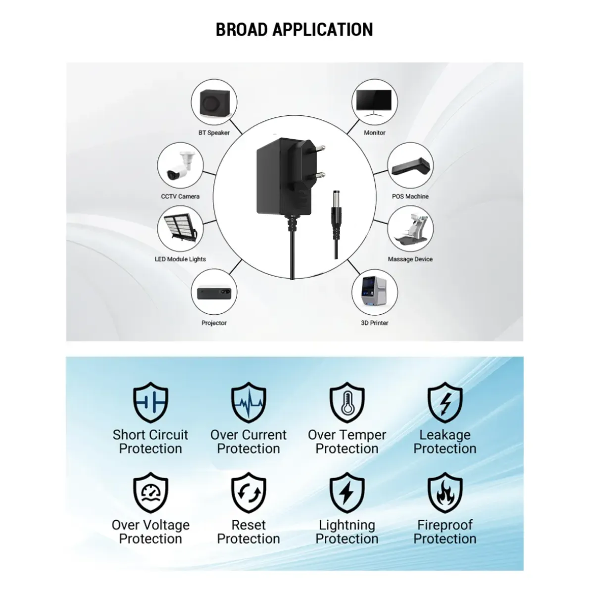2. Өзінің стандартты нұсқасы: 12В стандартымен және жалпы DC баррелі штепсельімен (әдетте 5.5 * 2.1 мм), маршрутизаторлар, желілік қосқыштар, қауіпсіздік камералары, Set-Top қораптары және ойын консольдері сияқты түрлі құрылғыларға өте ыңғайлы.