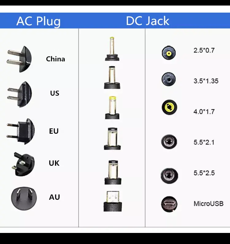 Коннектор түрі: стандартты DC Barrel қосқышы (Жалпы өлшемдер) 5,5 мм × 2.5mm немесе 5,5 мм × 2.5 мм, құрылғы талаптарына негізделген теңшелетін).