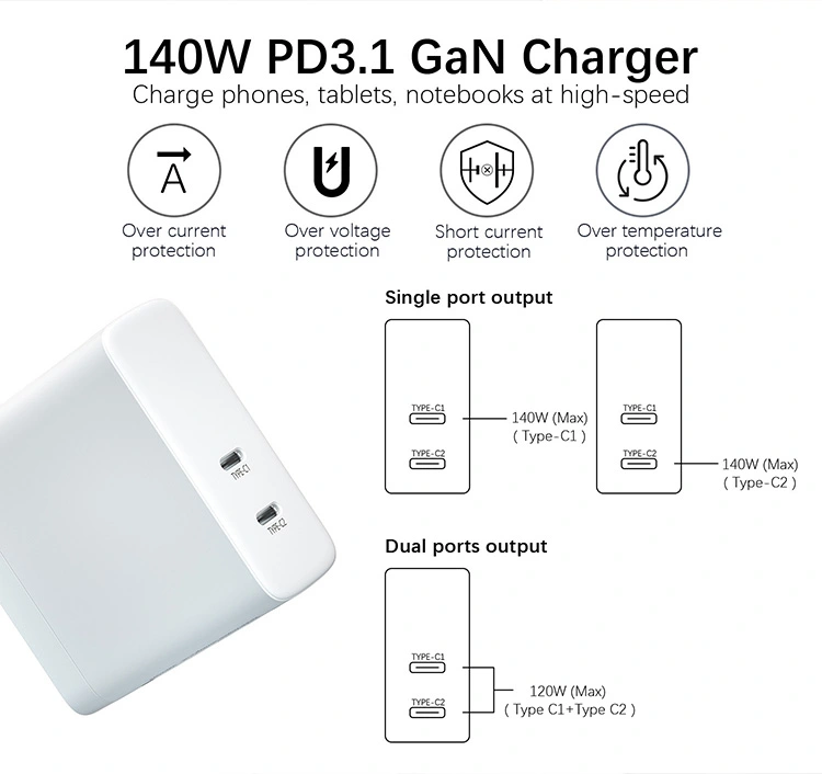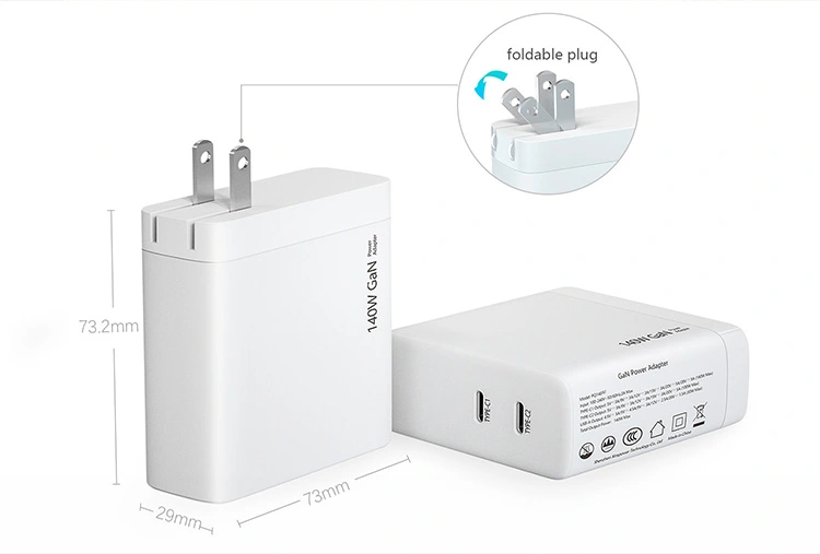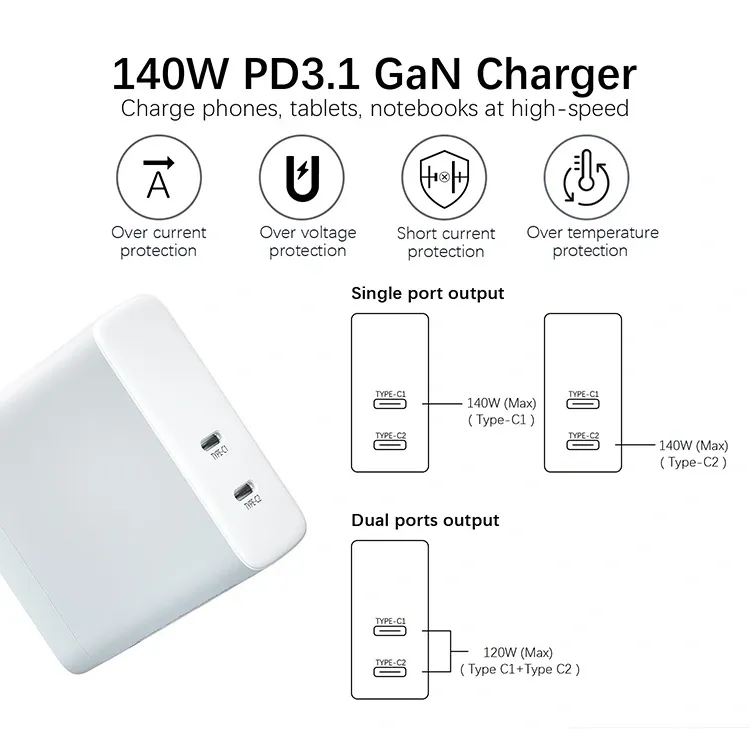 140w Қос USB C порты PD PD зарядтағыш Бізде PD зарядтағыш Жиындар: Біртұтас портта 140 Вт дейін қуат бере алады. Қос порттар шығару қуаты бір уақытта көп бөлінеді. Ноутбук пен ұялы телефонды бір уақытта зарядтағанда, тиімділік өзгеріссіз қалады.