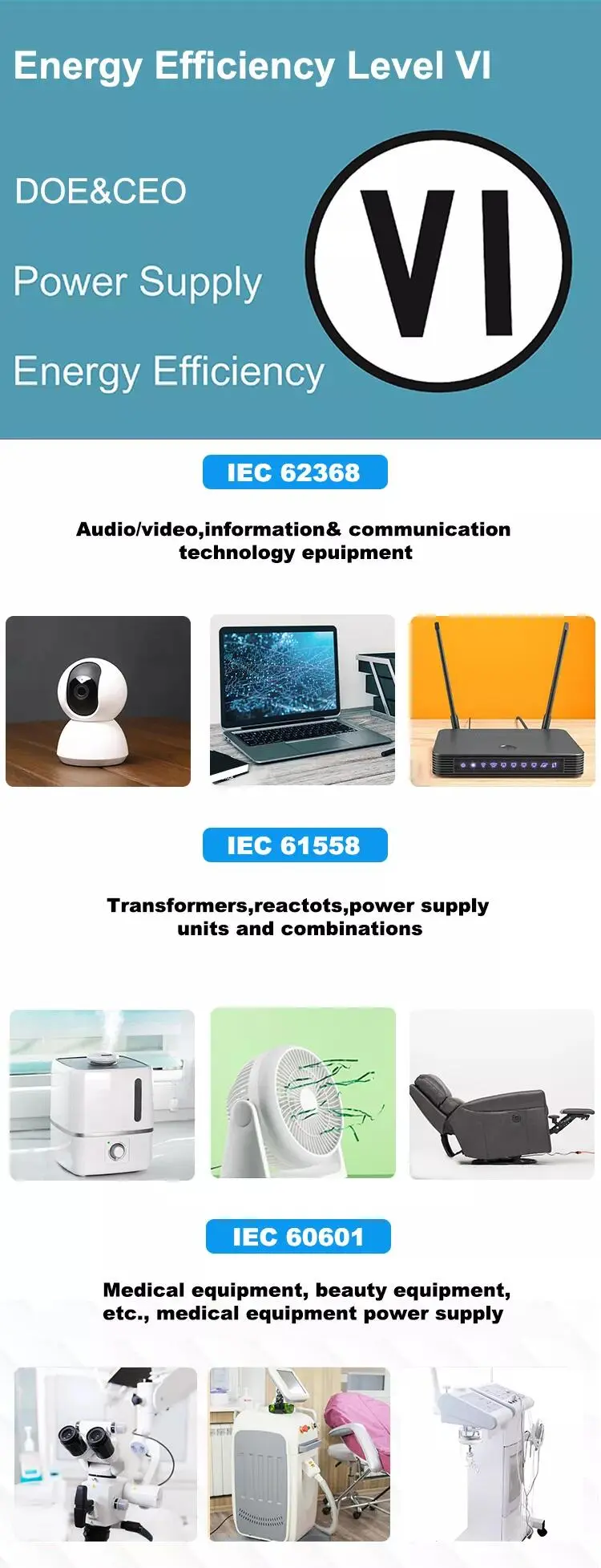 IEC62368 тұтынушы электроникасы үшін, IEC60335, IEC60335, Medic60601, медициналық-бағалық жабдық үшін IEC60601, IEC61558 Үйге арналған IEC61558, IEC61347 жарықдиодты жарықтандыруға арналған IEC61347. |
