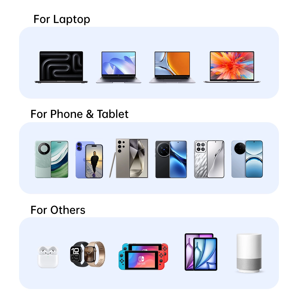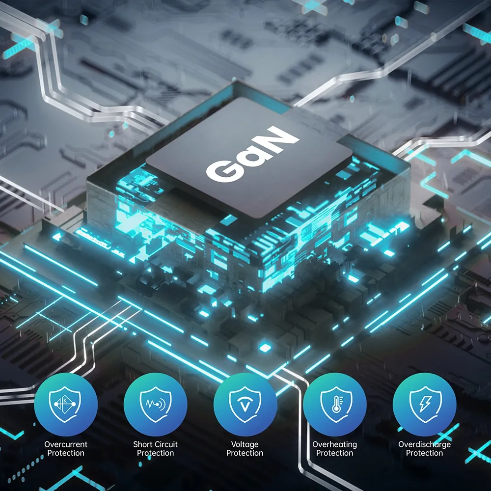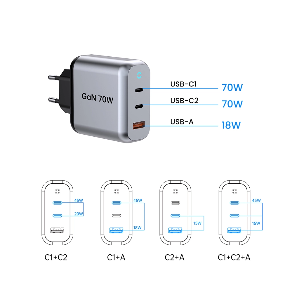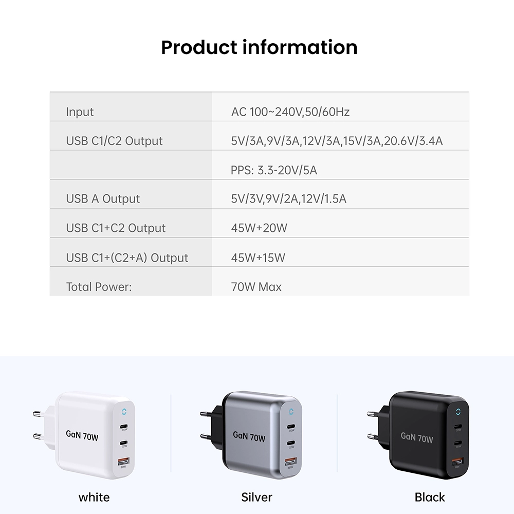 C1 / C2 Шығуы: 5В3а, 9v3a, 12v3a, 15v3a, 15v3a, 20.6V3.6V3.6V3.6 (Max Max) PPS: 3.3-11V 4.05A USB-A Шығу: 5В3а, 9v2a, 12v1.5A 3.3-11V 2a (22w Max) C1 + C2 Шығу: 45 Вт + 20w C1 + C2 + USB - шығысы: 45w + 5V3A Барлығы: 70 Вт |